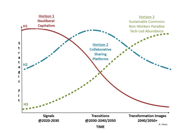 I recommend you read the book if you are so inclined because it takes a disciplined and systematic look at how we got here, why here (capitalism) isn’t sustainable, and what might come next. That is the appeal to me of going through Hines’ work. There is a system that he and the folks at Houston Foresight have built to examine these issues. There is no “shooting from the hip” about what one man thinks might happen to capitalism, but an thorough analysis of why capitalism is likely reaching the end of its road, and what might replace it.