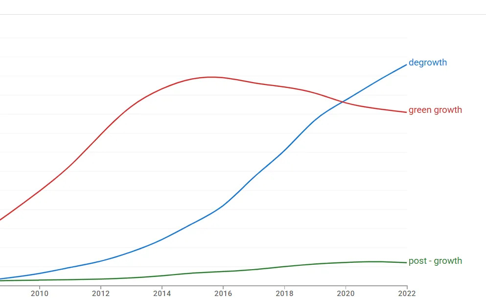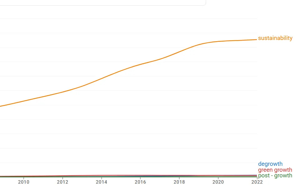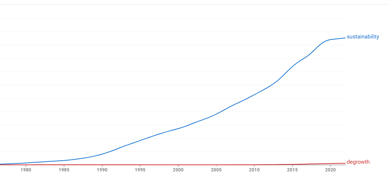 Degrowth still lags far behind “sustainability” in the public consciousness. So there is a long way to go to get to the point where “degrowth” is as ingrained in people’s minds as sustainability is today. We have climbed a hill, with a large mountain still ahead of us.