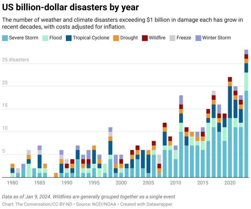In 2023, there were 28 weather and climate disasters in the U.S., surpassing the previous record of 22 in 2020. These disasters had a total cost of at least $92.9 billion.