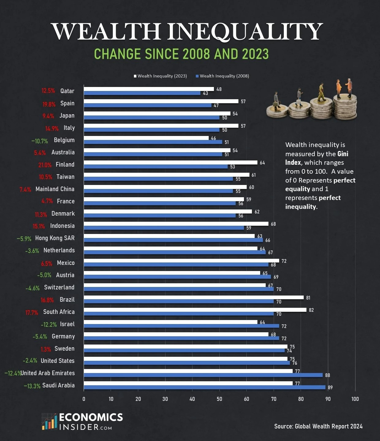 Check out this graphic for Economicinsider.com. It shows that wealth inequality as measured by the GINI coefficient has gotten worse in many countries from 2008 to 2023. The Gini coefficient in the United States, where I am, stayed about the same. (See the graphic for a tidy explanation of the Gini coefficient).