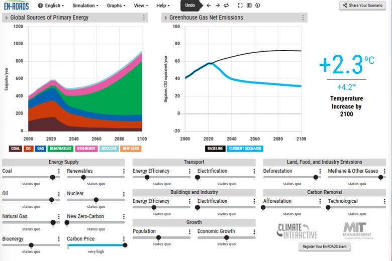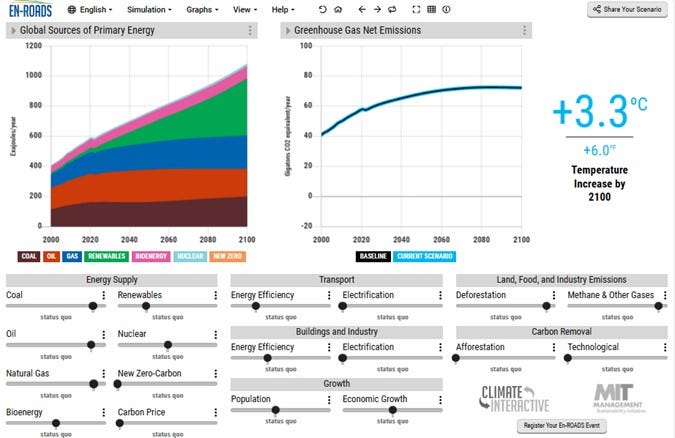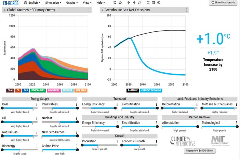 No one energy source is going to drive the energy transition. There is a great climate change simulator out there called En-ROADS that helps people visualize how we can address climate change. En-ROADS is a free resource developed by MIT and Climate Interactive to help people understand the impact certain policy decisions and assumptions have on climate change. The En-ROADS tool helps you see what policy and behavioral changes have on global warming by 2100. Below you can see the “before” simulation which represents our future in 2100 if we continue on the current path. You can then see the “after” simulation where I have moved all of the dials to the “optimal” position in which every type of climate mitigation option is taken, and taken quickly.